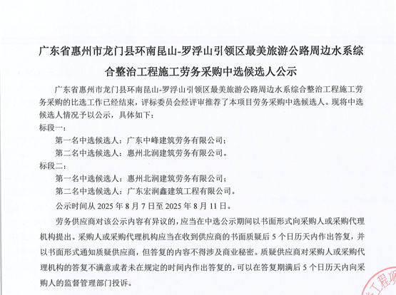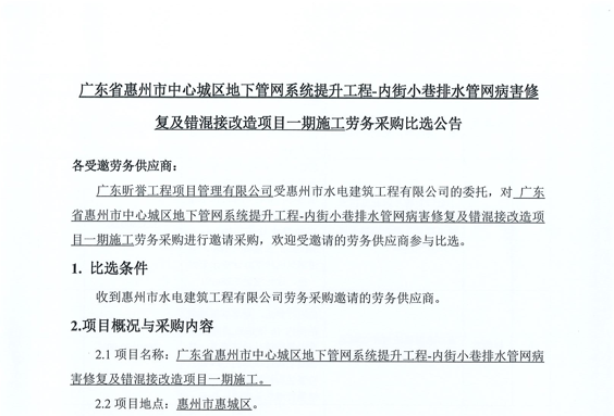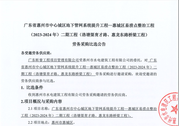 惠州市增江龍門段治理工程施工(一標段)勞務采購比選公告……